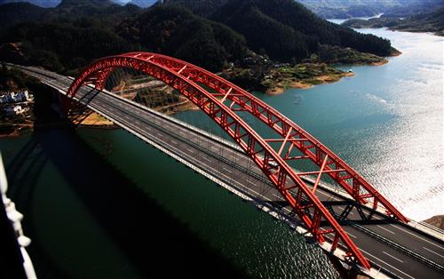 太平湖大桥位于国家高速公路G3京台高速铜陵至汤口段,跨越黄山太平湖,为中承式钢管提篮拱桥,大桥布置为(4×20+352+3×20)m。主拱肋采用空间变截面桁架式组合体系,主拱轴线采用悬链线线形,两拱肋在竖直面内向桥轴线侧倾斜,形成提篮式。两拱脚中心跨度为336m,矢高68m,跨径在同类桥型中位居亚洲第一。该桥已经成为安徽省推介“两山一湖”风景区一个新的代言词,也成为了游人进入“两山一湖”风景区的一座现代化的路标。
